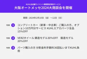 大阪オートメッセでも大商談会を開催いたしますのでこの機会に車両やエアロパーツの購入よろしくお願いいたします!