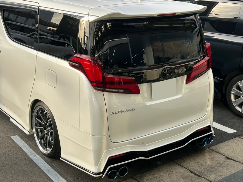 リアにもシンプルかつカッコイイカスタムが施されております。クールレーシング製のバンパーエアロに4本出しマフラーを装着する事でこれ以上にない迫力を醸し出すことができました。お好みでルーフエンドウィングや社外LEDテールランプをインストールしリアの上下のバランスの変化を楽しんでみるのもアリかと思います。以上、今回は大人気アルファードのご紹介でした。