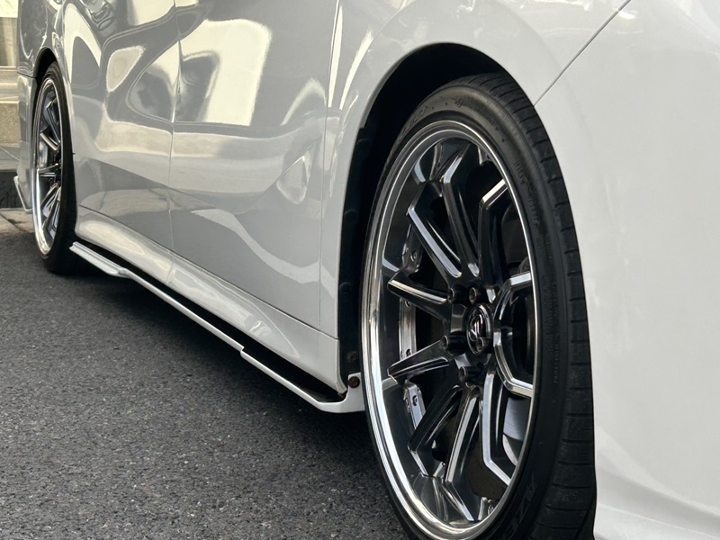 サイドにおきましては1体型のサイドディフューザーをチョイスいただきました。分割タイプと違って車のボディラインに統一的な一体感をもたらす事が可能となります。小さなお子様がいる方には乗り降りの際中に踏んでしまわないよう分割タイプをオススメいたします。差し色にならないメッキ系統のホイールをチョイスすることで全体的にバランスが上手に保たれたカッコイイ仕上がりとなっております。
