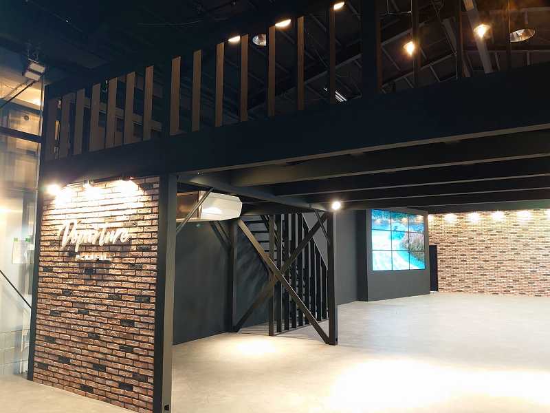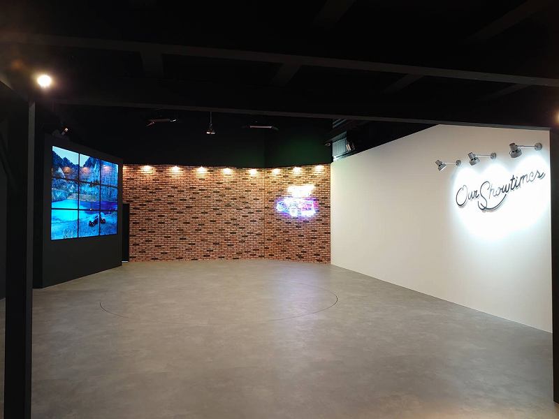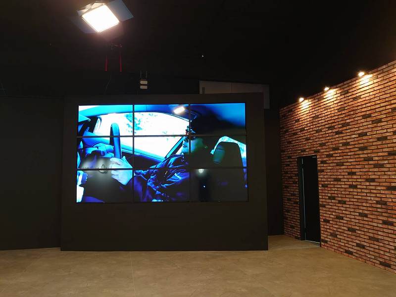 コンクリート調の床面とし、壁面左側には大型モニター、センターはレンガ造り、右側が白壁の仕様となっています。