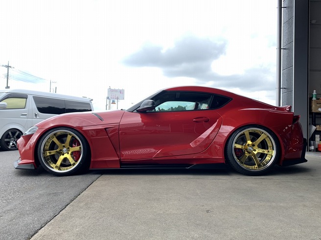 👆 このスープラワイドボディデモカー?(店長マイカー!)は、HKSさんの車高調にてローダウンし、VERZ-KRONEのKR01鍛造ホイールを装着しております。