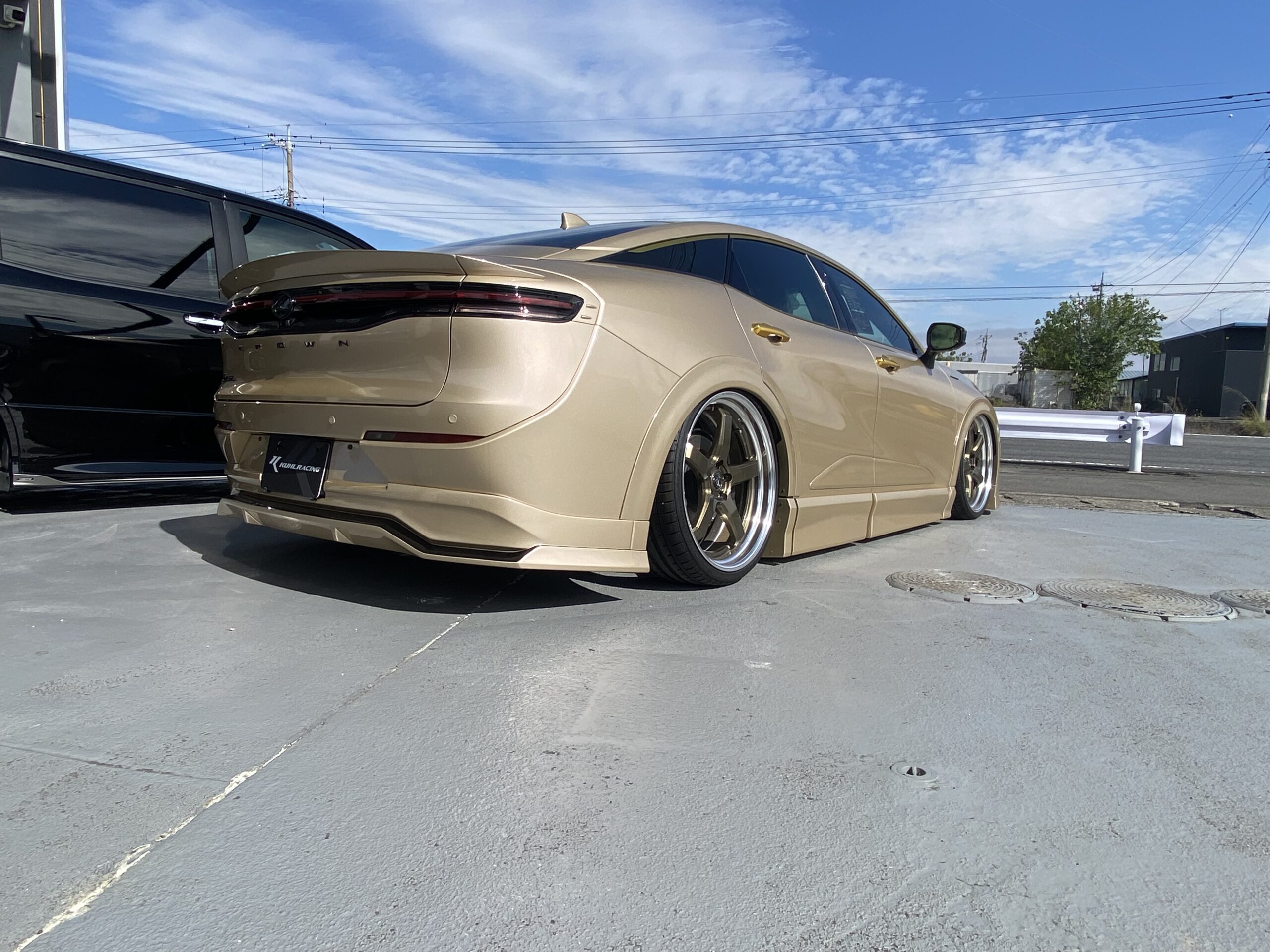 ゴールドカラーで、ホイールは弊社オリジナルのVERZ-WHEELの DDR01 21インチ KUHLエアロ フロントハーフスポイラー、サイドステップ、リアハーフスポイラー、エアーフォス製エアサスペンションが装置されています!