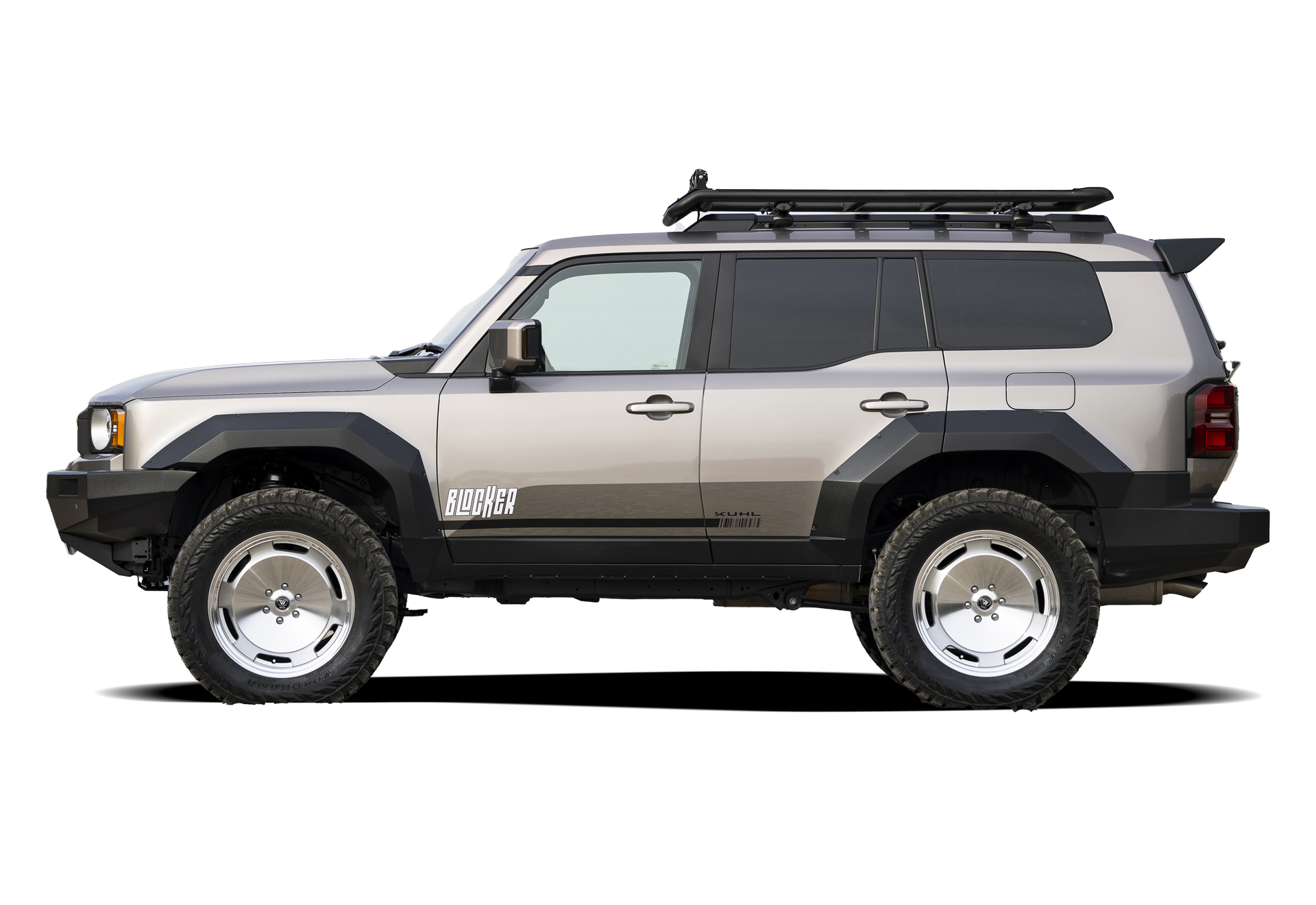 スチールを思わせる無骨な造形を、軽量な強化FRPで再構築。ショートカットバンパーやワイドフェンダーによる力強い面構成が、ランドクルーザー250に重厚な存在感を与える。